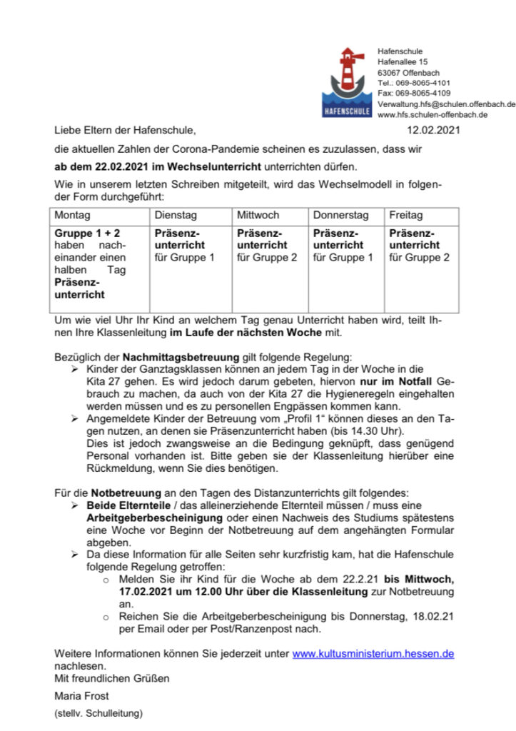 Einführung Wechselunterricht 12. Februar 2021 / Hier erhalten Sie die Bescheinigung zur Berechtigung für eine Notbetreuung Ihres Kindes.